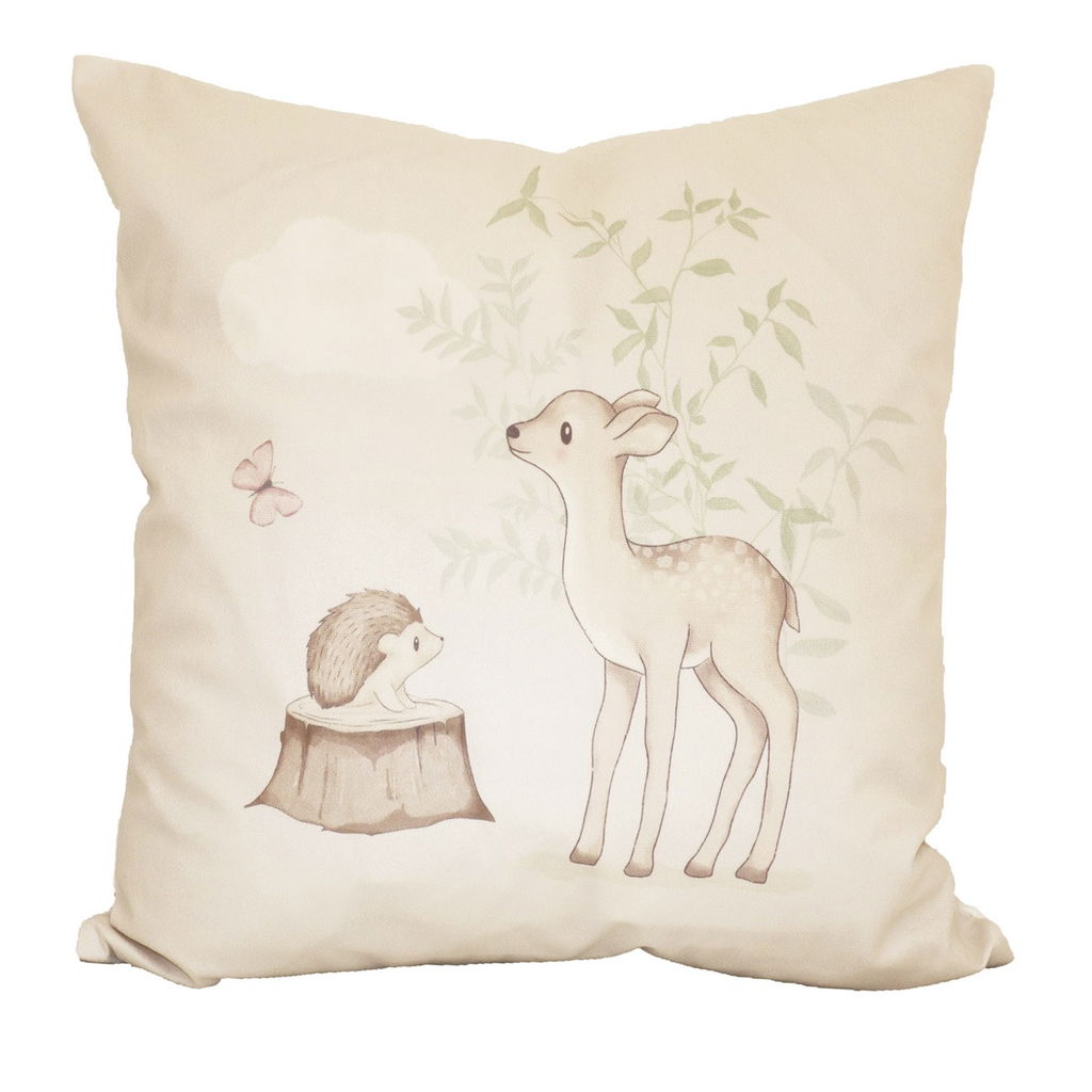 Skapa en harmonisk och inbjudande atmosfär med Bambi Beige Kuddfodral från Redlunds. Detta kuddfodral är tillverkat av mjuk beige sammet och pryds av ett förtjusande placerat tryck med en hjort, igelkott och fjäril, vilket ger en sagolik känsla till ditt hem. Den enfärgade baksidan och den dolda dragkedjan ger en stilren och elegant look. Kuddfodralet är OEKO-TEX® STANDARD 100 certifierat och säkerställer att materialet är fritt från skadliga ämnen. Perfekt att kombinera med matchande plädar för en komplett look.