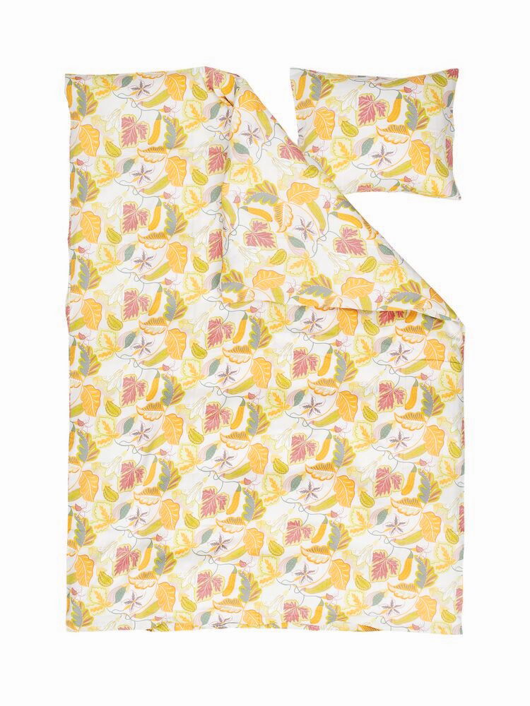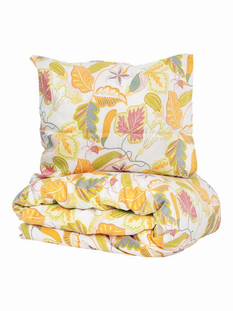 Låt sovrummet blomma upp med det vackra bäddset Brunnberg Multi i satinvävd bomull. Det livfulla mönstret med slingrande blad, blommor och frökapslar i varma gula och mjuka rosa toner skapar en inspirerande atmosfär som för tankarna till en frodig sommarträdgård. Den ljusa bottenfärgen låter de färgglada detaljerna ta plats och ger rummet en fräsch och luftig känsla.
