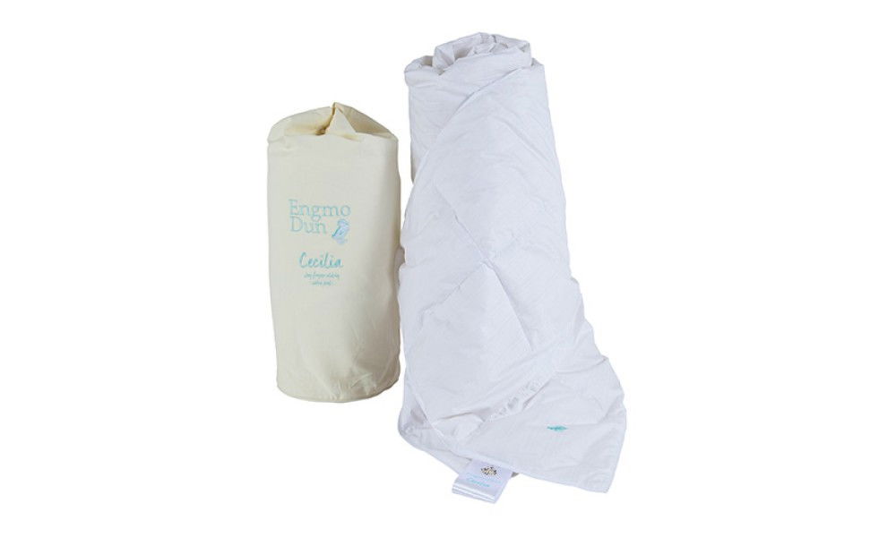 Fäst blicken på duntäcket Cecilia, som är en fjäderlätt bris ute till havs. Täcket svalkar behagligt en varm sommarnatt. Det mjuka täcket anpassar sig efter kroppstemperaturen och är fyllt med 90 % kvalitativt myskanddun från Europa. Täcket passar till den som är varm och vill ha ett svalare täcke.