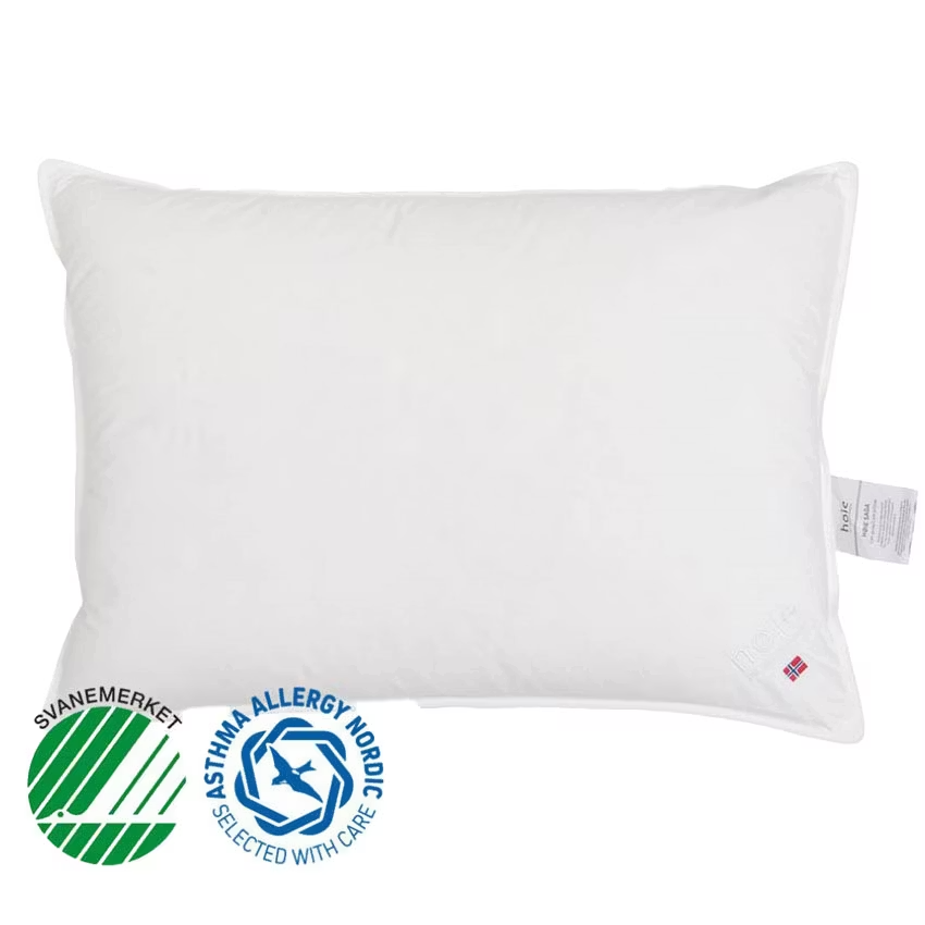 Höie Saga 3-kammars dunkudde är allergivänlig, rekommenderas av av Asthma Allergy Nordic och har miljömärkningen Svanenmärket. Kuddarna levereras i tre olika höjder för individuell anpassning för bästa komfort och har ett ekologiskt tyg i mjukt, extra fint bomullscambric.