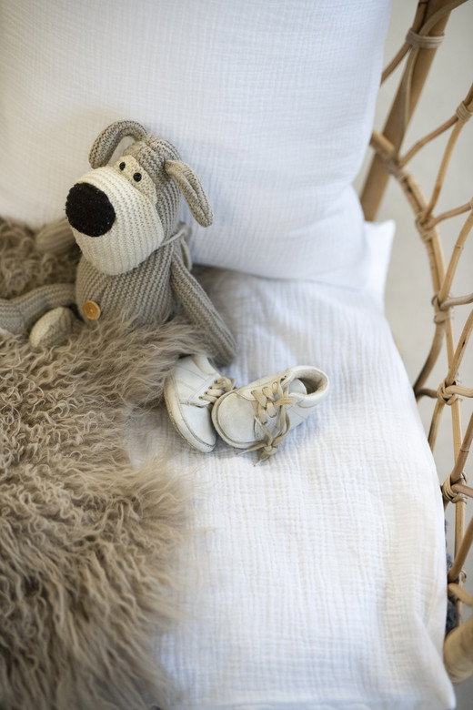 Den krinklade designen ger ett charmigt och avslappnat uttryck som passar perfekt i barnrummet. Den vita färgen är tidlös och lätt att kombinera med andra textilier och färger i inredningen, vilket skapar en lugn och harmonisk sovmiljö för ditt barn.
