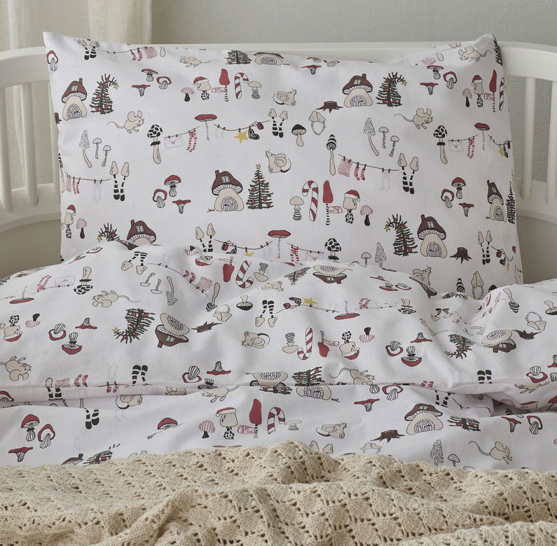 Här skapas julmyset direkt med det vackra bäddsetet Fingal Jul för spjälsäng. Fingal Jul har fullt av svampar och söta, svampliknande hus blandat med polkagrisar och julgranar över hela bäddsetet i vackra färger. Fingal Jul är bäddsetet till den som vill ta in en mysig touch till barnrummet till julen och passar perfekt till den lilla svampälskaren!