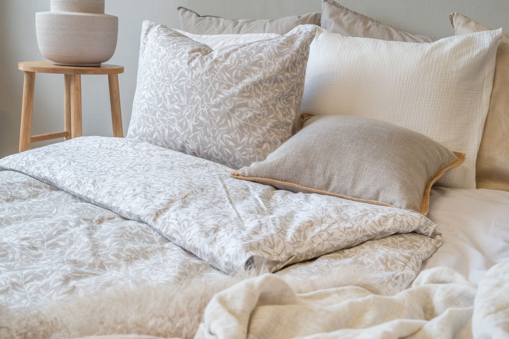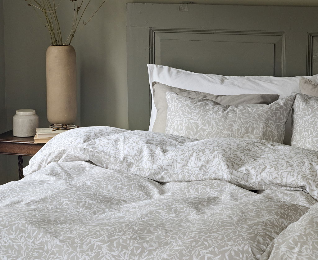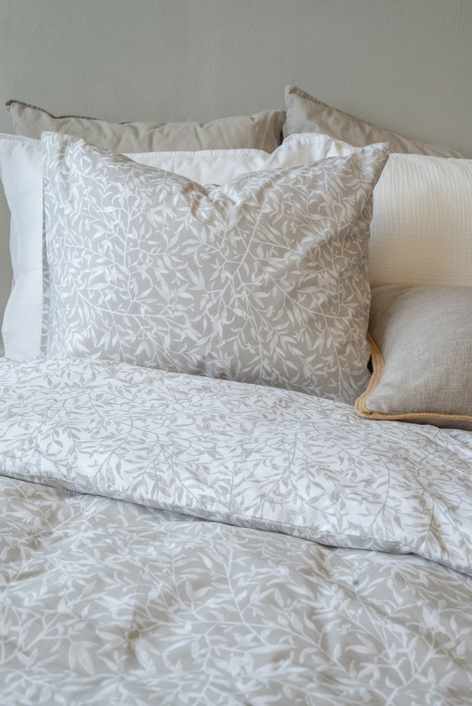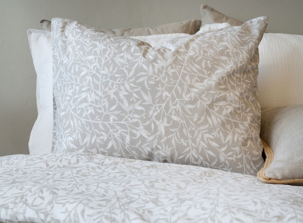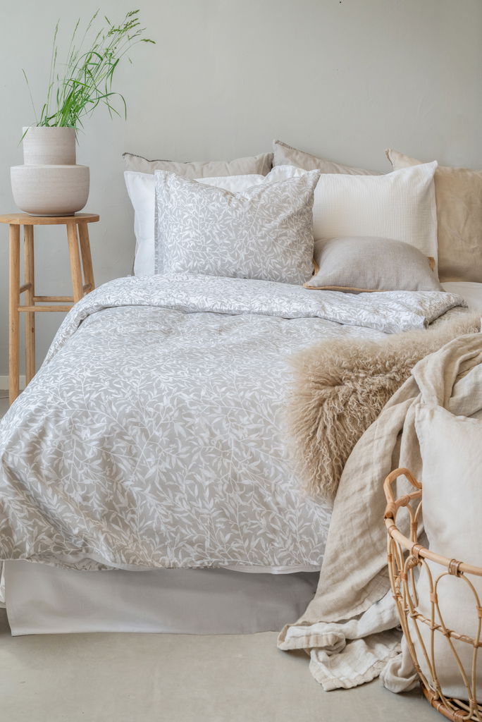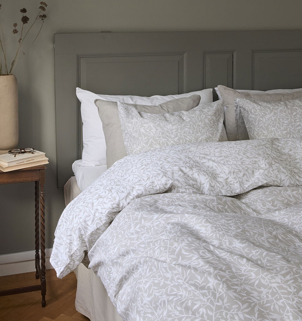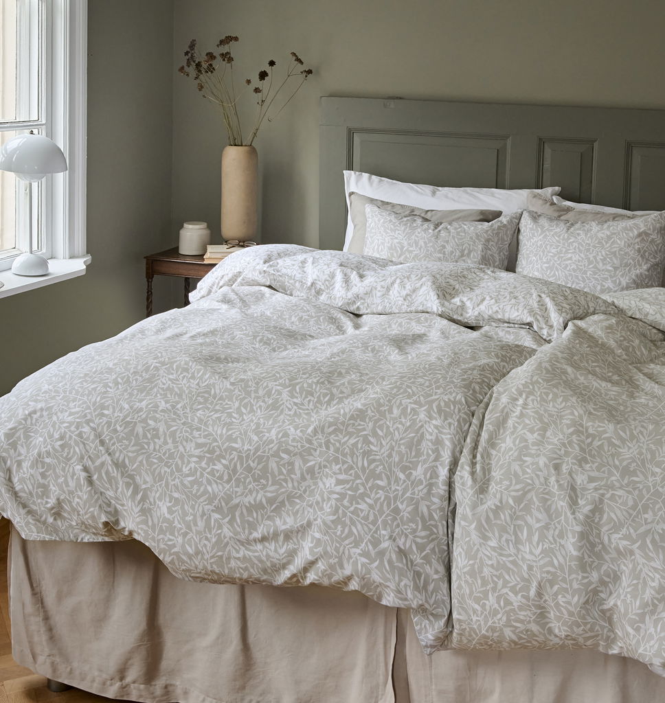 Garden är ett somrigt bäddset som har ett fint mönster av små blad, precis som en härligt fin trädgård. Bäddsetet har en fin ton av beiget och vitt som kompletterar varandra på ett elegant sätt. Påslakanet är dubbelsidigt, där ena sidan har vita blad med en beige bottenfärg och andra sidan har beigea blad med en vit bottenfärg. Skapa en vårig känsla i sovrummet inför säsongens härligheter med Garden!