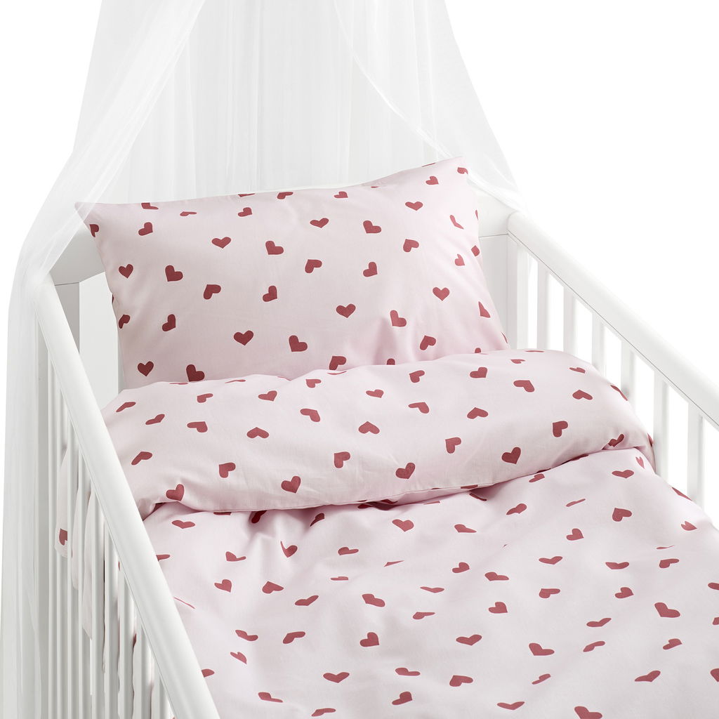 Hjärtrud Spjälsäng bäddset från Borganäs of Sweden med ett fint hjärtmönster i ljusa rosa nyanser som skapar en varm och mysig känsla. Tillverkat av 100% OEKO-TEX-certifierad bomull som är mjuk, skön och fri från skadliga ämnen för ditt barns trygghet. Påslakanet har praktiska hörnhål och örngottet kuvertöppning för enkel bäddning. Perfekt för att skapa en ombonad och trygg sovplats i spjälsängen.