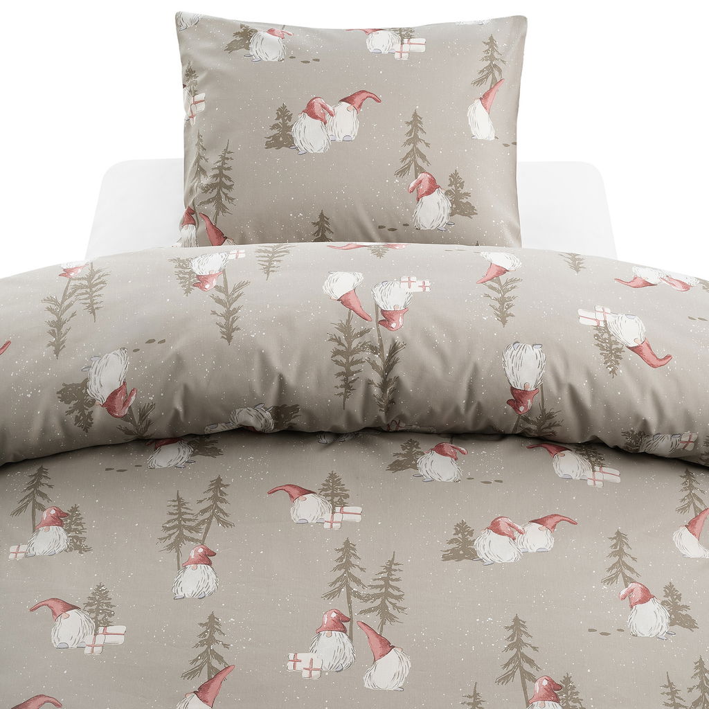 Juletid Greige bäddset från Borganäs of Sweden skapar en värmande julstämning i sovrummet. Det detaljerade julmotivet med tomtar och granar pryder det greige färgade tyget, vilket ger en hemtrevlig känsla. Setet innehåller ett påslakan 150x210 cm och ett örngott 50x60 cm, båda tillverkade i hållbar polyester microfiber som är lätt att underhålla. Hörnhål i påslakanet och kuvertöppning i örngottet gör bäddningen enkel och bekväm. OEKO-TEX-certifieringen garanterar en säker produkt för både människa och miljö.