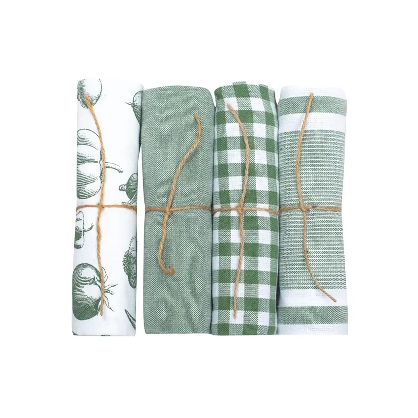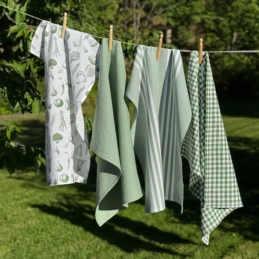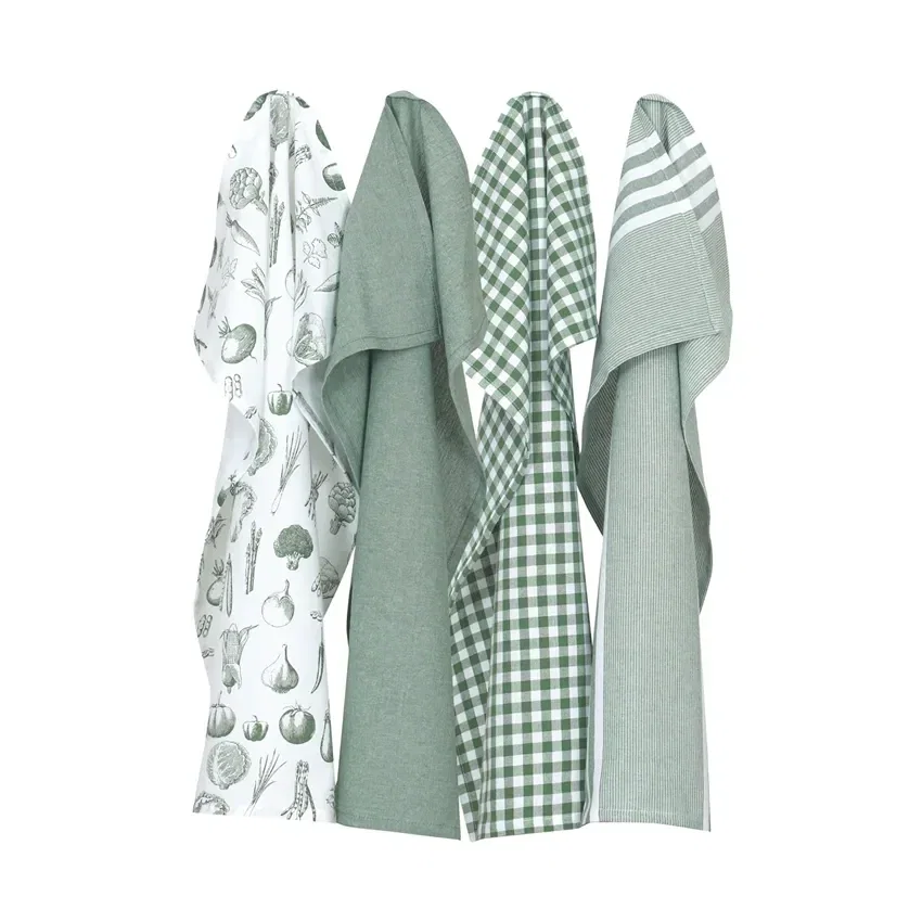 Här är ett fyrpack med fina kökshanddukar tillverkat av återvunnet material i grönt och vitt. Handdukarna har fyra olika mönster: en enfärgad i spräcklig chambray, en rutig, en med smala ränder och en med matinspirerade motiv. Mixen mellan dessa designs ger liv till köket på ett dekorativt sätt. Lägg till en ny detalj i köket samtidigt som att göra ett bra miljöval!