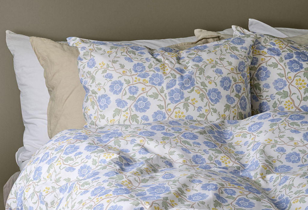 Detta vackra bäddset från Borganäs of Sweden förvandlar ditt sovrum till en harmonisk oas. Med ett elegant blommigt mönster i blått och beige mot en vit bakgrund, ger det en känsla av lugn och stil. Den mjuka bomullen är skonsam mot huden och trådtätheten på 144 TC säkerställer en god nattsömn. Setet innehåller ett enkelt påslakan och ett örngott, båda dekorerade med det naturnära mönstret. Påslakanet har hörnhål för en smidig bäddning och örngottet har en klassisk kuvertöppning som hjälper till att hålla kudden på plats. Perfekt för att skapa en fräsch och inbjudande sovmiljö.
