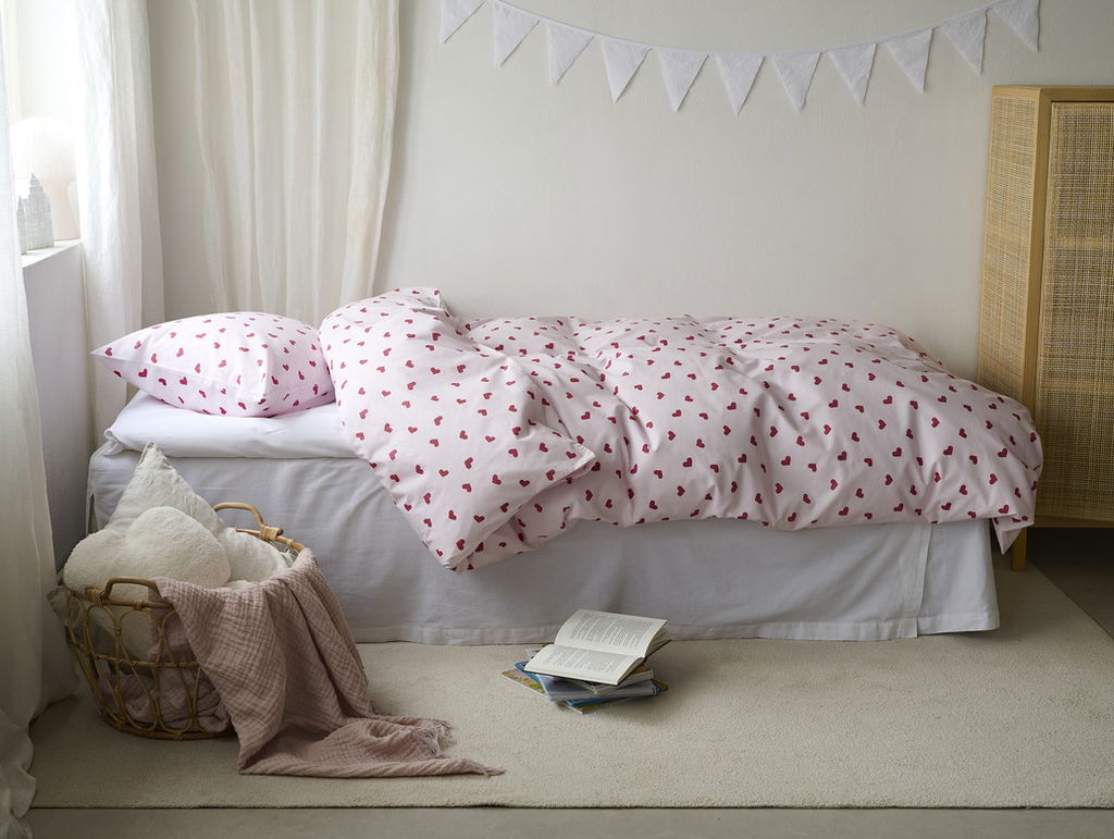 Hjärtrud bäddset från Borganäs of Sweden kombinerar stil och komfort med sitt charmiga hjärtmönster i rosa toner. Bäddsetet är tillverkat av 100% bomull och erbjuder en mjuk och inbjudande känsla som bidrar till en god natts sömn. Med en trådtäthet på 144 TC är materialet både hållbart och behagligt mot huden. Bäddsetet inkluderar ett påslakan med praktiska hörnhål för enkel bäddning och ett örngott med kuvertöppning för att hålla kudden på plats. Perfekt för att ge sovrummet en romantisk och ombonad atmosfär!