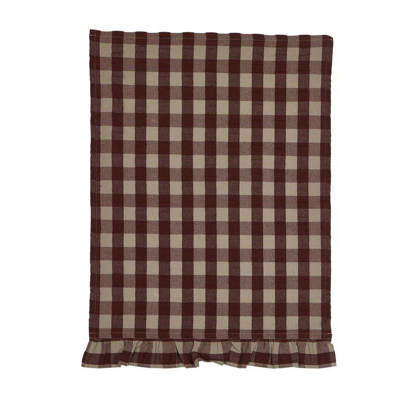 Klassisk kökshandduk i tidlöst vinröd-rutigt mönster med veckad volang. Tillverkad i 100% OEKO-TEX-certifierad bomull som kombinerar lantlig charm med modern funktionalitet.