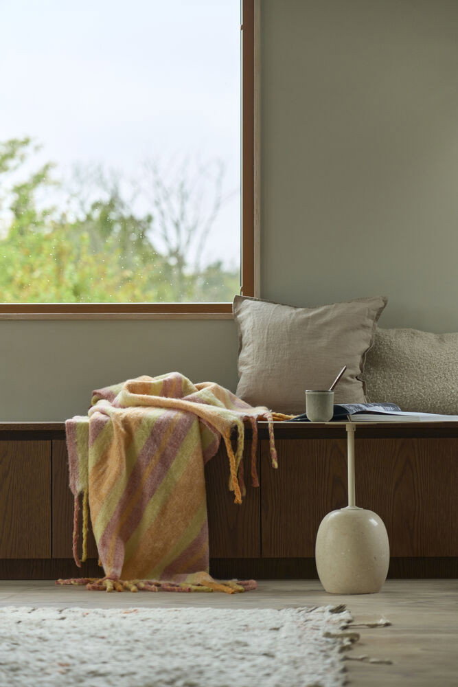 Pläd Tanum från Kosta Linnewäfveri kombinerar stil och funktion. Vävd i en blandning av ull och akryl, erbjuder den både värme och hållbarhet. Den randiga orange, rosa och gula designen och mjuka, fransade kanter ger en elegant touch. Perfekt för kalla kvällar eller som en snygg inredningsdetalj.