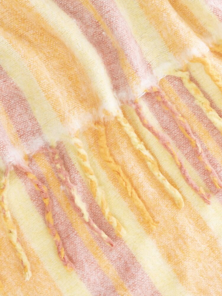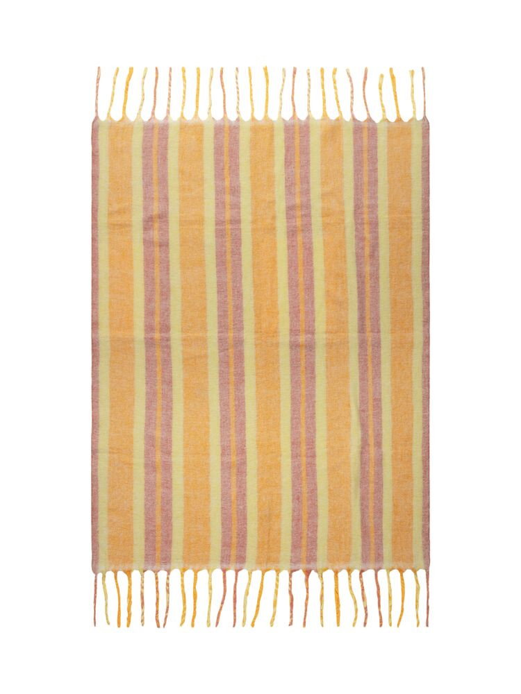 Denna pläd har en elegant randig design i orange, rosa och gula toner. De mjuka och långa fransarna ger en extra dimension och ett avslappnat utseende.