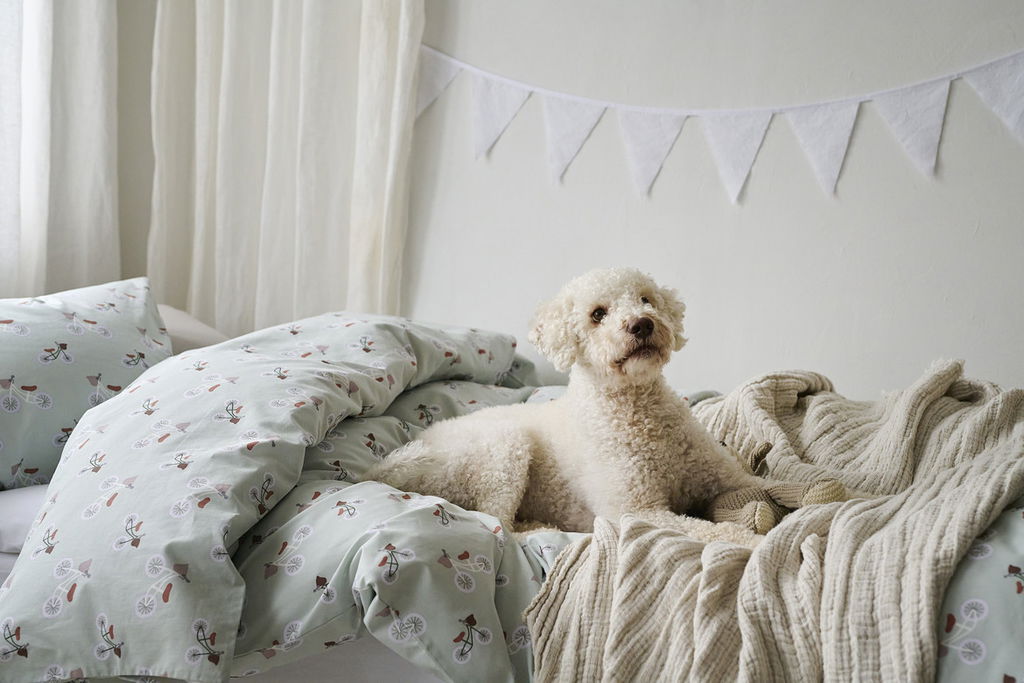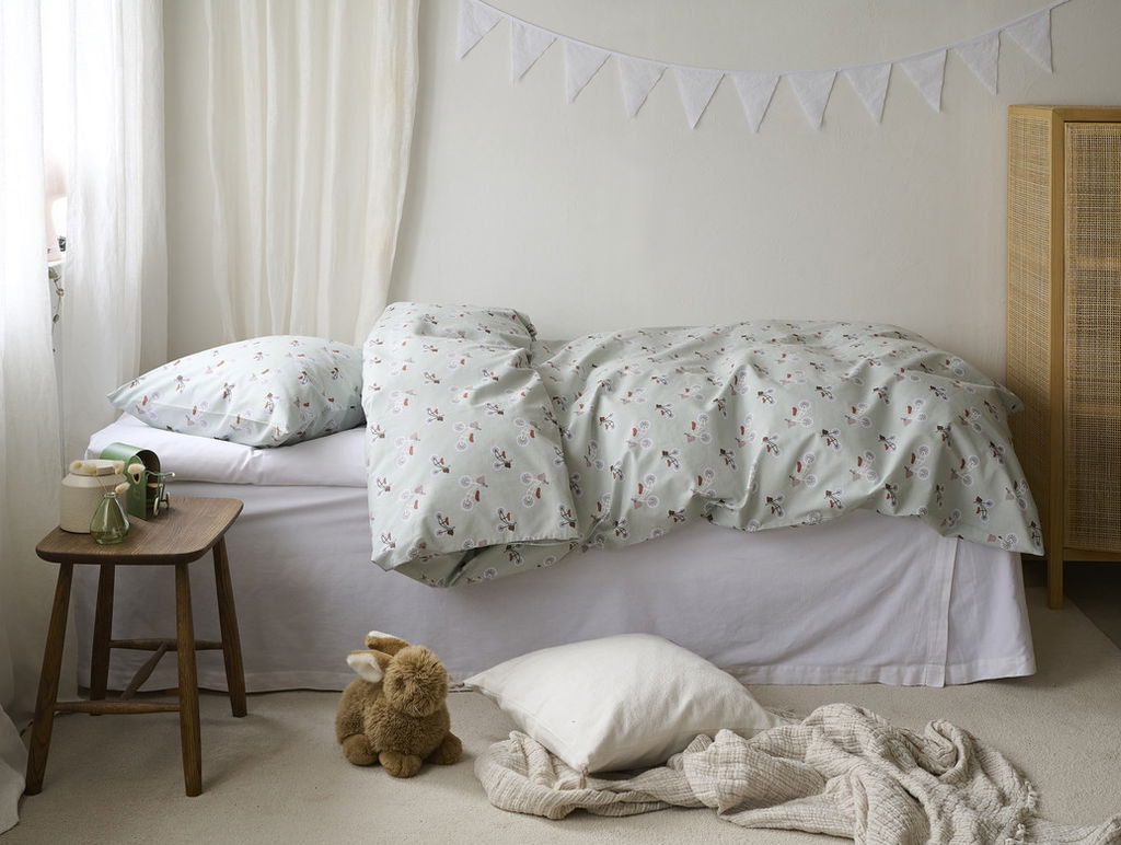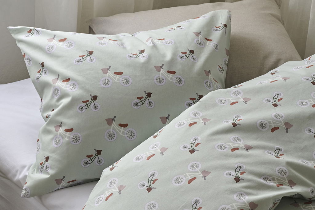 Ett lekfullt bäddset i 100 % bomull med ett charmigt cykelmönster på ljusgrön botten. Plingeling Grön förvandlar sovrummet till en härligt inbjudande plats och skapar en fräsch, lättsam och hemtrevlig känsla, perfekt för både barnrum och vuxna som gillar en lekfull stil.