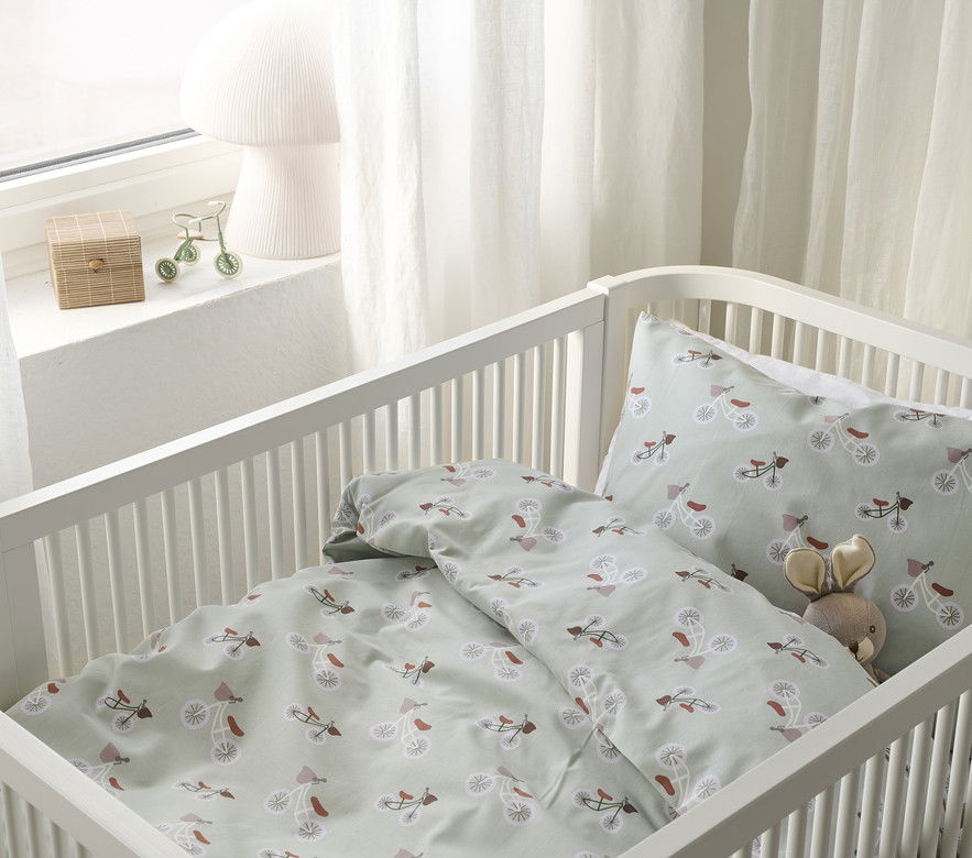 2-Dels Set Plingeling Spjälsäng Grön från Borganäs of Sweden är ett mjukt och behagligt bäddset i 100 % bomull. Den ljusgröna botten med charmigt cykelmönster ger barnrummet en lekfull och harmonisk känsla. Bomullskvaliteten (144 TC) gör tyget mjukt och skonsamt mot barnets hud och ger en trygg sovmiljö. Påslakanet är utan hörnhål för extra säkerhet och örngottet är försett med kuvertöppning för enkel användning.
