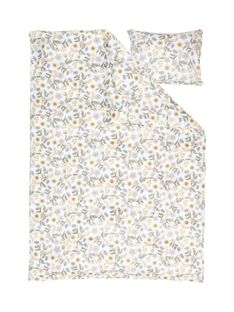 Förvandla sovrummet till en harmonisk oas med detta vackra bäddset i satinvävd bomull. Det romantiska blommönstret med solrosor och sommarblommor i mjuka nyanser av blått, gult och grönt skapar en lugn och inbjudande atmosfär. Den ljusa bottenfärgen framhäver det detaljerade mönstret och ger rummet en fräsch och luftig känsla.