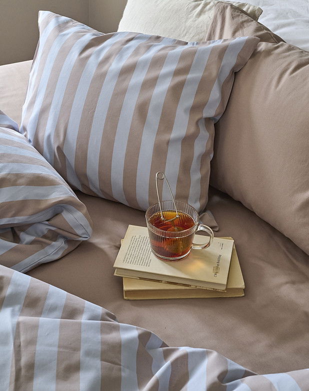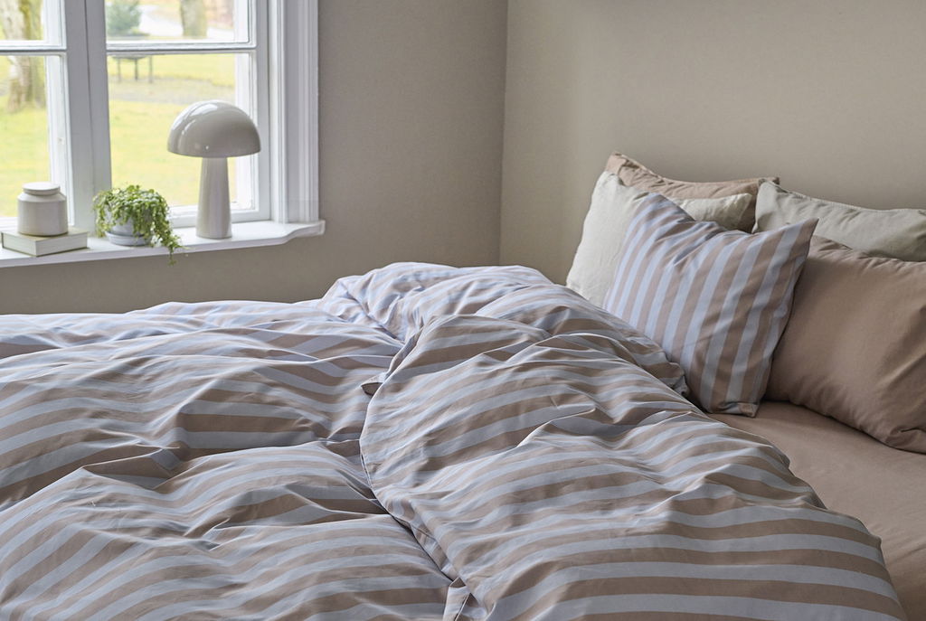 Med hörnhål i påslakanet blir bäddningen enkel och örngottets kuvertöppning håller kudden säkert på plats. Kombinationen av färger ger ett inbjudande och lugnande intryck, vilket skapar en harmonisk atmosfär i sovrummet.
