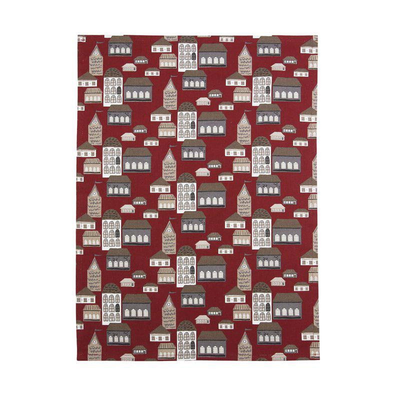 Det detaljrika mönstret visar en pittoresk samling av hus i olika stilar och storlekar mot en varm röd bottenfärg. Husen är illustrerade i neutrala toner som vitt, grått och beige, vilket skapar en harmonisk och tidlös känsla. Det lekfulla motivet ger en inbjudande och mysig atmosfär till köket och fungerar lika bra som praktisk handduk som dekorativ inredningsdetalj.