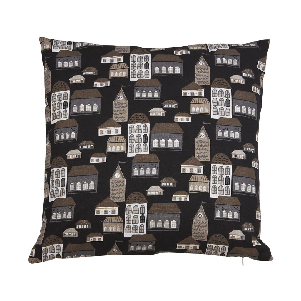 Det detaljrika mönstret visar en pittoresk samling av hus i olika stilar och storlekar mot en fin svart bottenfärg. Husen är illustrerade i neutrala toner som vitt, grått och beige, vilket skapar en harmonisk och tidlös känsla. Det lekfulla motivet ger en inbjudande och mysig atmosfär till köket och fungerar lika bra som praktisk handduk som dekorativ inredningsdetalj.