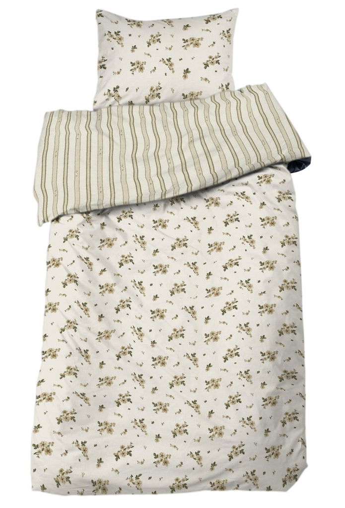 Upplev lantlig charm med vackra bäddsetet Stina i bäckebölja. Tillverkat av 100% bomull, kombinerar det eleganta beige blommor med stilrena ränder för en sval och inbjudande sovupplevelse. OEKO-TEX certifierat.