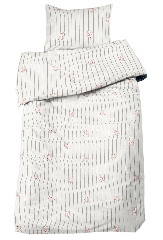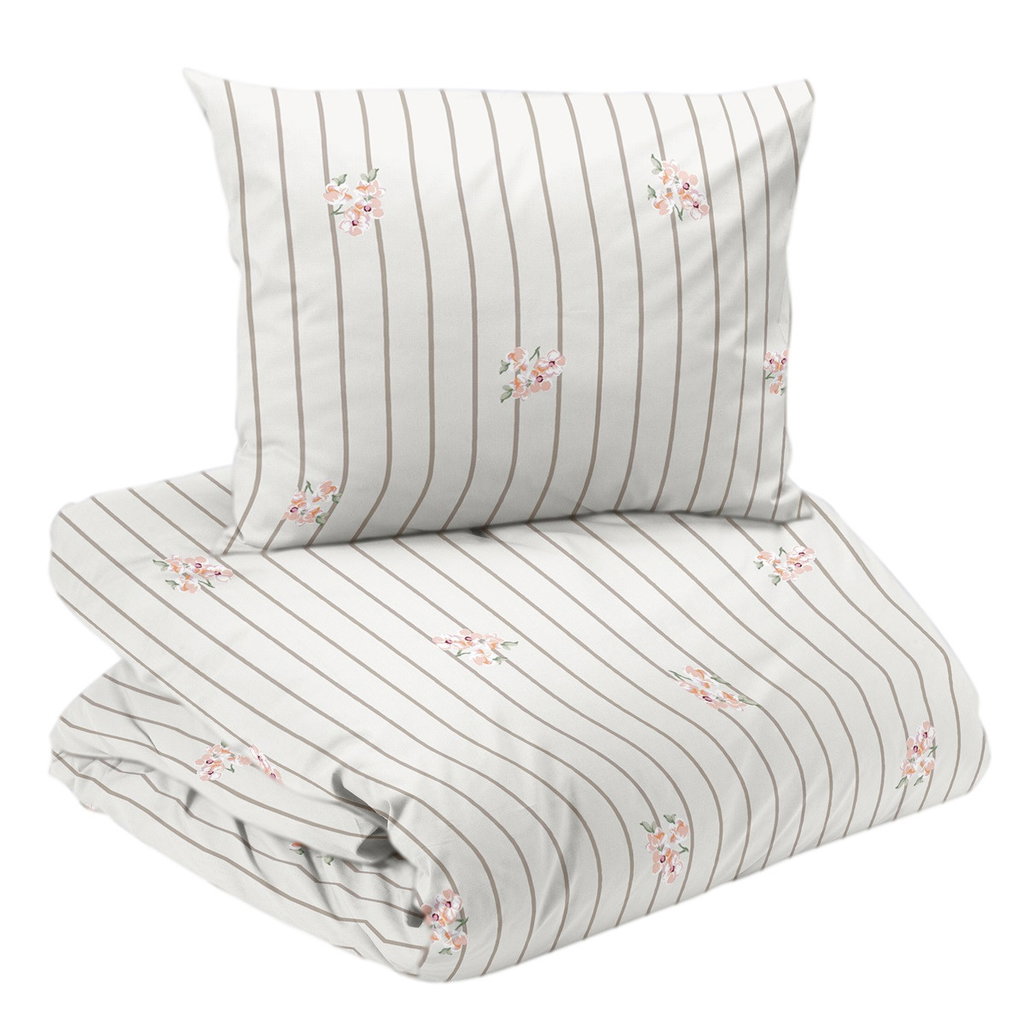 Ge sovrummet en varm och romantisk känsla med detta stilrena bäddset i ett klassiskt randmönster med vackra blomsterbukettar. De tunna beige ränderna mot den krämvita botten skapar en lugn och elegant grund, medan de varsamt utplacerade bukettarna i mjuka rosa och persikotoner tillför en söt vacker touch.